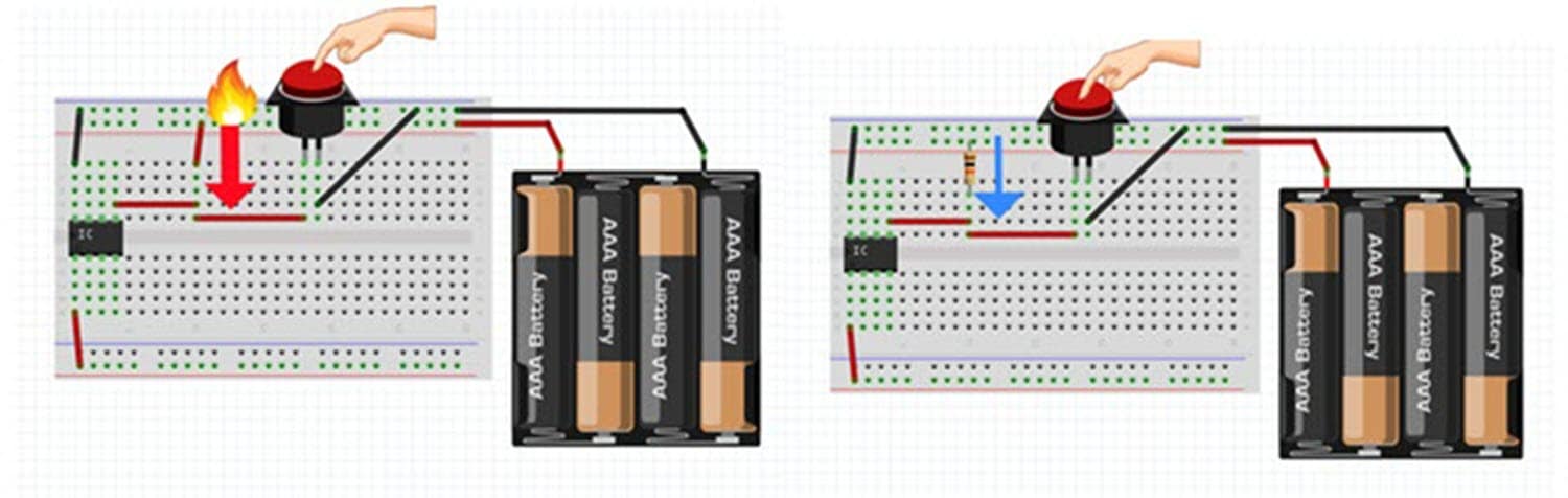 Figure 1:  Just running a wire allows for a short circuit (Left). A pull-up resistor prevents floating inputs while as preventing an unwanted short circuit (Right). (Source: Author)